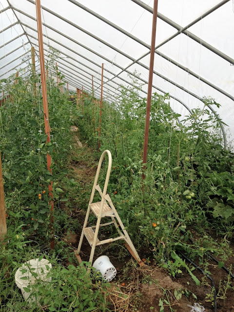 When I finished spraying I made some hangers. Then out to house one to hang the tomato plants. These cherry tomatoes were sprawling all over the ground. I got them hung in spite of how tangled they were. In the photo they are on the left. I cut of the branching and they and the weeds are on the floor of the isle.