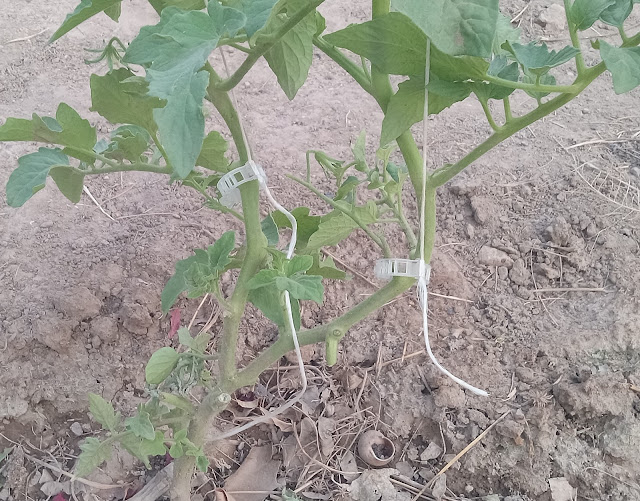 I pruned this tomato plant, It shows the tomato clips attached to the bottom of the tomato plants.This shows the row of tomato plants. Each plant has two branches.